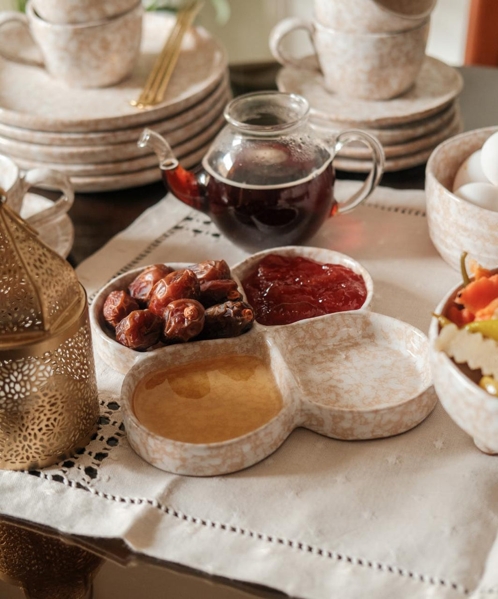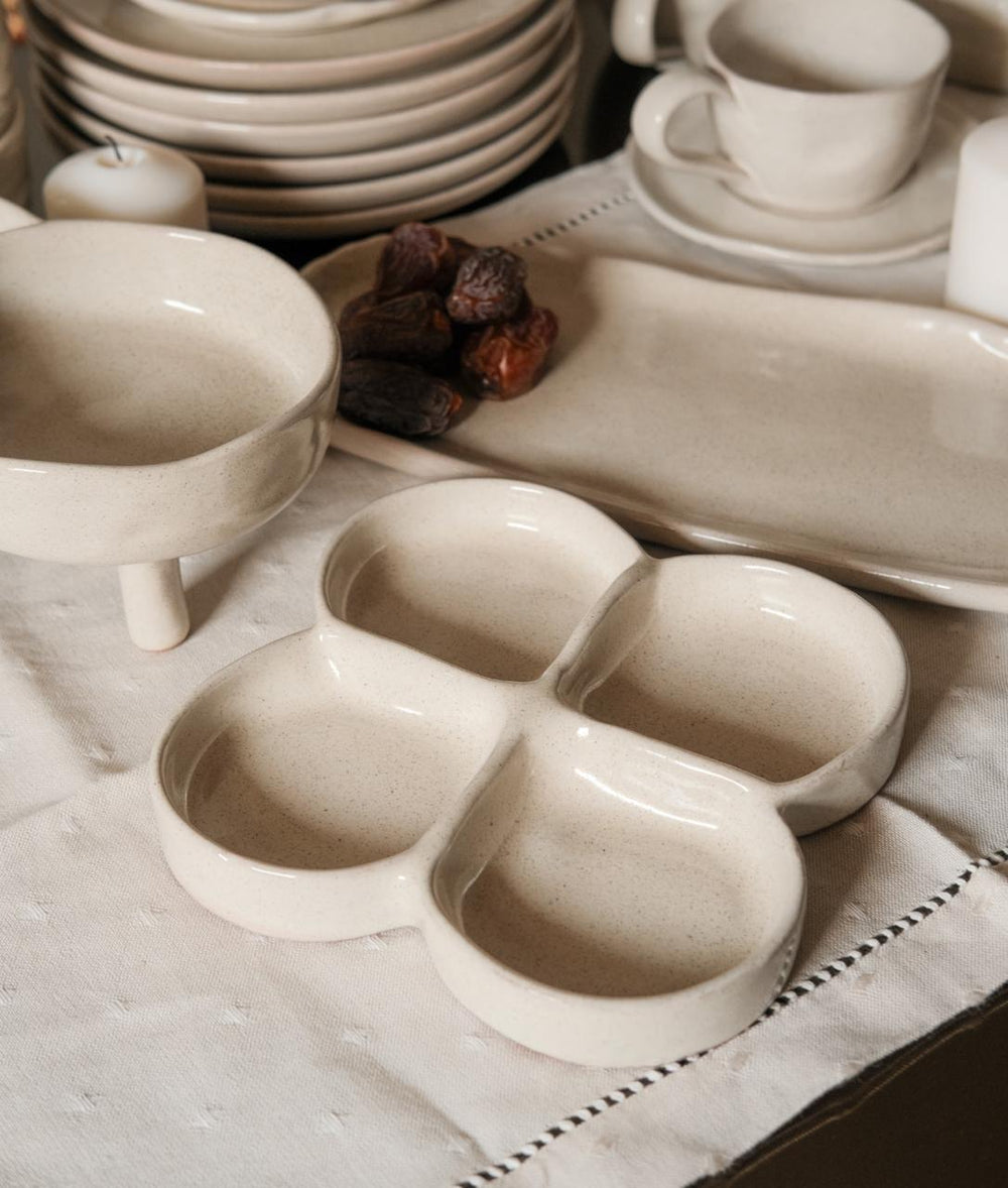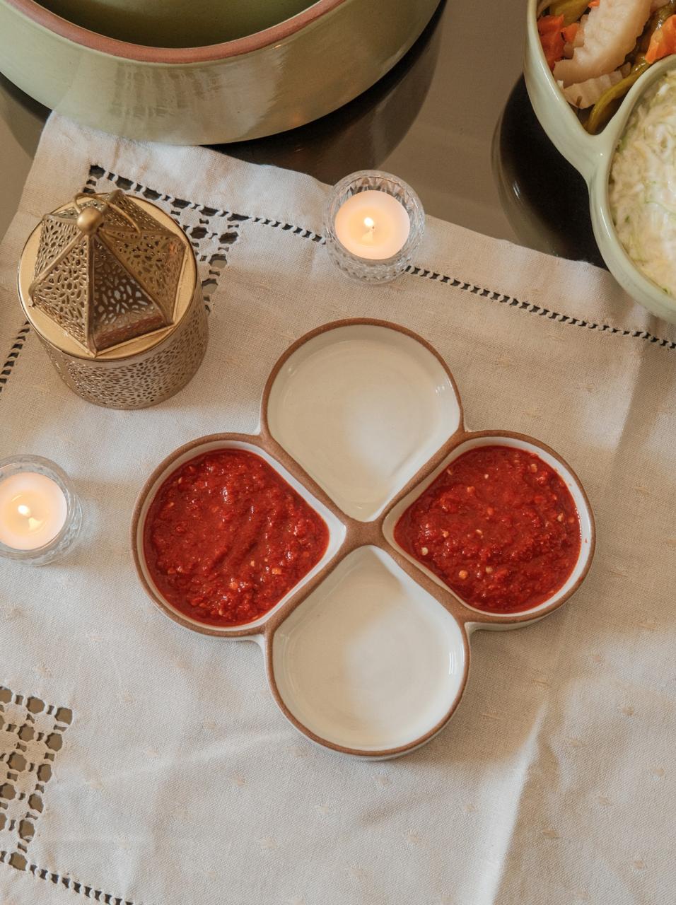 A versatile handcrafted pottery platter, perfect for serving sauces, nuts, dips, and bite-sized appetizers with timeless elegance. Its artisanal charm makes it suitable for both everyday dining and special gatherings.