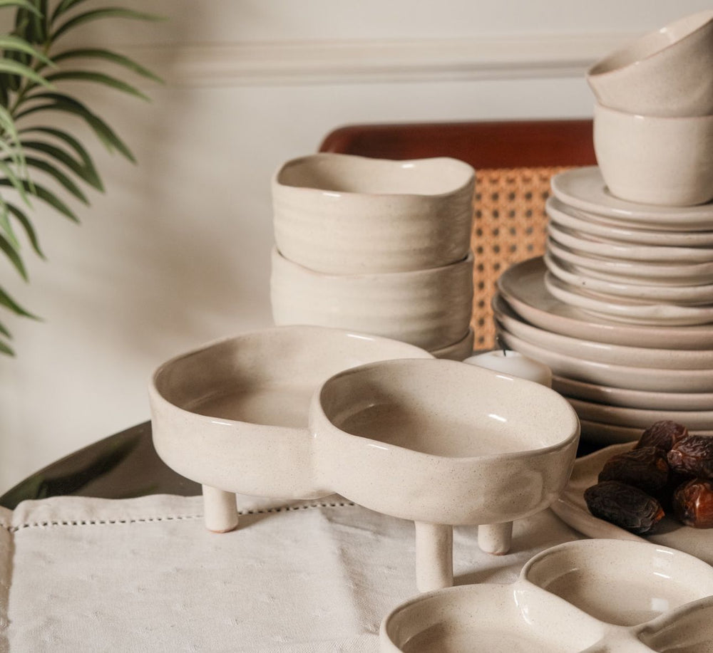 A versatile handcrafted pottery platter, perfect for serving sauces, nuts, dips, and bite-sized appetizers with timeless elegance. Its artisanal charm makes it suitable for both everyday dining and special gatherings.